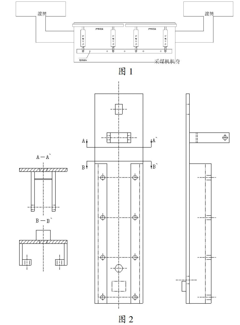 加工2組可調(diào)式護(hù)幫架,利用采煤機(jī)機(jī)身現(xiàn)有螺栓和銷軸,固定在采煤機(jī)機(jī)身上面(如圖1),護(hù)幫架由護(hù)幫千斤頂、導(dǎo)向槽、護(hù)幫梁組成(如圖2),護(hù)幫時(shí),利用采煤機(jī)的高壓水,控制護(hù)幫千斤頂活塞桿的伸縮,帶動(dòng)護(hù)幫梁擠壓煤壁,護(hù)幫梁與煤壁之間加設(shè)大、小柈,增加護(hù)幫面積,從而達(dá)到護(hù)幫的目的。采煤機(jī)作業(yè)時(shí),護(hù)幫架隨著采煤機(jī)移動(dòng),不需要人工搬運(yùn),實(shí)現(xiàn)了機(jī)載,護(hù)幫架對(duì)采煤機(jī)司機(jī)操作采煤機(jī)沒(méi)有影響,對(duì)采煤機(jī)正常運(yùn)行沒(méi)有影響。