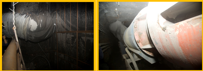 除塵風(fēng)機無疑是巖巷掘進最好的降塵設(shè)備之一,工作面正常施工中,使用1臺KCS-550D型濕式除塵風(fēng)機配合綜掘機,實現(xiàn)抽壓結(jié)合,通過除塵風(fēng)機進行一級降塵;然而在實際使用過程中卻發(fā)現(xiàn)該設(shè)備存在一定的設(shè)計缺陷?,F(xiàn)有的除塵方法只能滿足除塵風(fēng)機至工作面80m左右范圍內(nèi)的作業(yè)環(huán)境,除塵風(fēng)機將工作面粉塵經(jīng)過設(shè)備降塵后排出,造成后部的粉塵速度增快,巷道內(nèi)能見度只能在1m左右,運輸人員只能在停止掘進時進行作業(yè),極大的影響生產(chǎn);并且粉塵隨意飛揚導(dǎo)致巷道幫、頂、風(fēng)筒、管路、電纜及其他設(shè)備設(shè)施上粉塵嚴(yán)重超標(biāo),除塵風(fēng)機的使用并沒有真正意義上將粉塵進行根治,相反為沿線施工作業(yè)人員埋下了嚴(yán)重的安全隱患。通過積極而有效的探索,對粉塵形成的原因和目前除塵風(fēng)機除塵效果不佳的研究和分析,找到了其主要原因有:除塵風(fēng)機排除塵的乏風(fēng)因風(fēng)速過高,除塵效果差,導(dǎo)致除塵風(fēng)機后部乃至沿線粉塵嚴(yán)重超標(biāo)。同時除塵風(fēng)機骨架風(fēng)筒直徑不合理,Ф600mm的骨架風(fēng)筒徑小,除塵力不足,易破損;Ф800mm的骨架風(fēng)筒徑大,抽力小,影響作業(yè)空間。