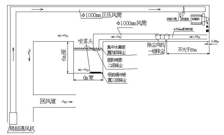 ⑵ 粉塵通過除塵風(fēng)機抽取后,沿除塵風(fēng)機后接設(shè)的φ1000mm風(fēng)筒集中排放到除塵硐室,在除塵風(fēng)筒末端集中排塵口處安設(shè)一組圓型噴霧,將集中排放過來的粉塵通過專用集中水幕進一步過濾降塵,此為二級降塵。