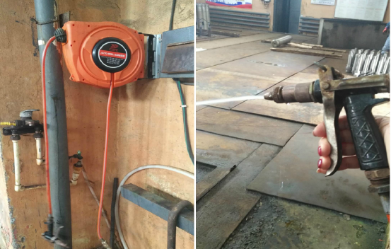 該處水源主要用于鍍前處理沖洗,使用卷管器可避免水管拖在地上被操作者踩踏或被工件砸壞而產(chǎn)生地面積水。清洗水流通過噴槍噴嘴后水流沖洗效果更為理想,用水時(shí)按住噴槍的彈簧手柄水就會(huì)不斷流出,松開手后水流自動(dòng)停止,杜絕常流水現(xiàn)象,用水量大大減少,從而排入綜合處理池需要處理的廢水量明顯減少。