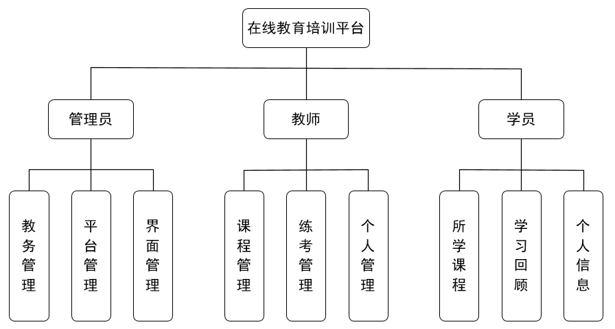 平臺分為三種角色,分別為管理員、教師和學(xué)員。三種賬號有各自的登錄窗口,根據(jù)不同角色的職責(zé)具有相應(yīng)的系統(tǒng)功能。具體系統(tǒng)結(jié)構(gòu)詳見圖2。