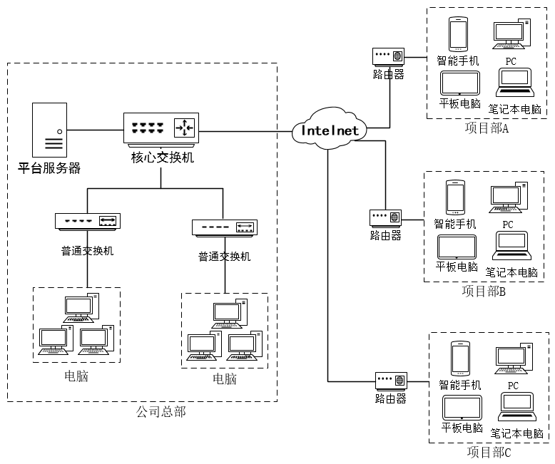現(xiàn)階段光纖與4G網(wǎng)絡(luò)的覆蓋面很廣,項目部的網(wǎng)絡(luò)接入問題可以得到很好的保障。我們只需將平臺部署在公司總部的機(jī)房內(nèi),分配專用服務(wù)器并配置外網(wǎng)IP,選定簡單好記的專用域名,通過第三方平臺解析指向外網(wǎng)IP,讓員工可以通過域名訪問平臺。同時,直接分配三層交換機(jī)的千兆端口與平臺服務(wù)器直連,保證平臺的訪問速度。系統(tǒng)部署的網(wǎng)絡(luò)拓?fù)鋱D見圖1。另外,將移動端APP程序的下載連接部署在平臺首頁,讓員工可以通過二維碼掃描下載移動端APP(僅Android)。這樣不論你在任何地方,只要有網(wǎng)絡(luò)即可訪問平臺,參加學(xué)習(xí)及考試。