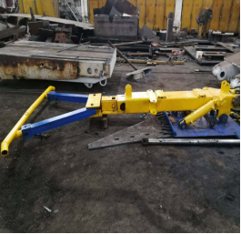 (2)安裝機(jī)載臨時(shí)支護(hù)裝置。利用2臺(tái)起重機(jī)將機(jī)載臨時(shí)支護(hù)裝置整體吊到掘進(jìn)機(jī)電機(jī)與減速機(jī)上方,調(diào)整好孔位,安裝好連接螺絲并緊固。用起重機(jī)將截割部吊起,拆除兩側(cè)截割部與回轉(zhuǎn)機(jī)構(gòu)相連接的連接銷(xiāo),更換加長(zhǎng)連接銷(xiāo),將機(jī)載支護(hù)底座、截割部與回轉(zhuǎn)機(jī)構(gòu)連接并緊固。