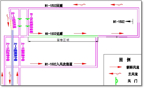 由于N1-1502工作面瓦斯涌出量較高,通過(guò)優(yōu)化通風(fēng)方式,留巷后將“兩入一回”調(diào)整為“一入兩回”,通風(fēng)方式由Y形通風(fēng)變?yōu)閃形通風(fēng)。在此基礎(chǔ)上,工作面推進(jìn)后,首先在碎石幫噴射柔性快速密閉噴涂材料,待留巷變形穩(wěn)定后,再噴射混凝土漿液進(jìn)行永久密閉。