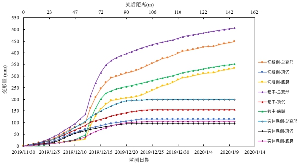 圖3為測(cè)站#1在不同的架后距離時(shí),巷道不同變形內(nèi)容監(jiān)測(cè)曲線,包括實(shí)體煤側(cè)、巷道中、切縫側(cè)隨時(shí)間發(fā)展的頂?shù)装逡平?、頂板下沉量、底臌量?/p>