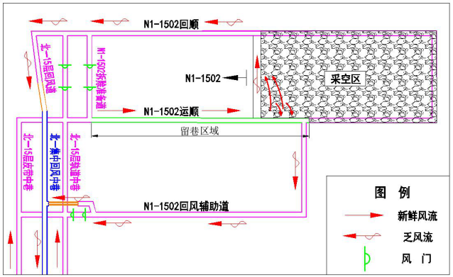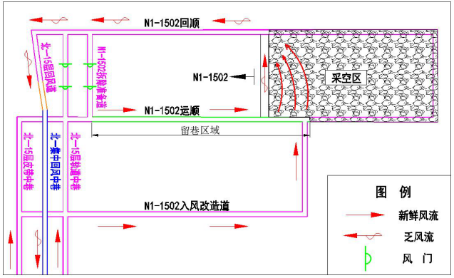 圖5 曉南礦N1-1502工作面調整后期通風系統(tǒng)圖