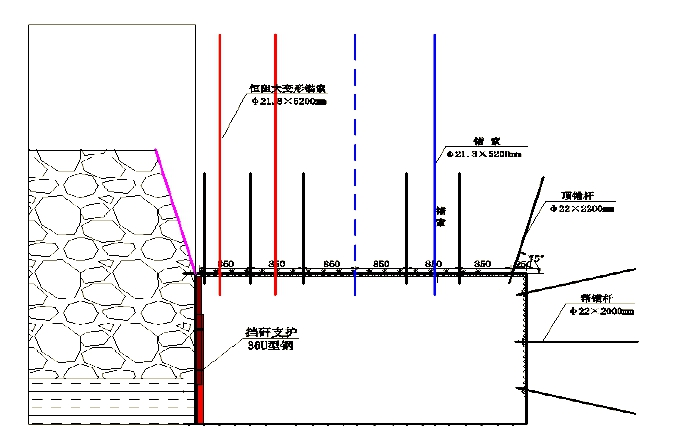 第一步:利用恒阻錨索對巷道頂板加強支護,以保證隨后預裂頂板、切頂時不影響自動形成的巷道質量;