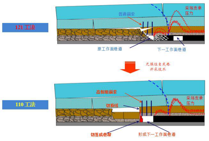 采用“110工法”切頂卸壓自動成巷技術,每回采一個工作面,只需掘進一條順槽,不用留設護巷煤柱。通過恒阻錨索加強頂板支護,保證恒阻錨索吊住上覆巖層基本頂,并使用聚能管進行頂板定向預裂爆破,工作面周期來壓時頂板能沿著預裂方向將頂板切落下來形成巷幫,切斷壓力傳導,實現(xiàn)卸壓作用,最后使用架后擋矸支護維護新形成的巷道作為下一個工作面順槽,改變?yōu)橐幻嬉幌锊删蚰J健τ跁阅系V安全高效開采具有重大的技術、經(jīng)濟、社會意義。 圖2 110工法與121工法對比圖