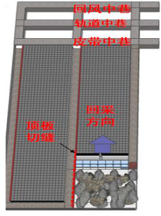 第三步: 工作面煤層回采后,在礦山壓力作用下, 將頂板切落下來形成巷幫 ,利用原巷道并經(jīng)加強支護形成新巷道, 同時借助巖石碎脹系數(shù)使巖石破碎后的體積增大為原來的1.3倍,壓實并隔斷采空區(qū),從而自動形成下一條回采巷道。