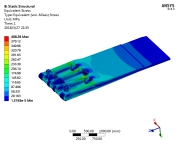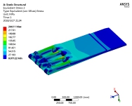 ??????? 工況1條件下的液壓支架頂梁應(yīng)力云圖可見,頂梁的應(yīng)力主要分布柱窩和中間筋板附近。柱窩附近的應(yīng)力達到峰值,已達244.11MPa,并且由于偏置載荷的作用,左側(cè)柱窩的應(yīng)力高于右側(cè)柱窩應(yīng)力。頂梁中間筋板左側(cè)上部的應(yīng)力比較大,已達156.21MPa,而在頂梁右側(cè)的柱窩附近應(yīng)力達135.88MPa,左右柱窩處應(yīng)力差為20.33MPa。液壓支架在實際使用過程中經(jīng)常出現(xiàn)立柱頂斷銷軸后活塞桿頂進液壓支架頂梁的情況,此處分析與實際工況相符。頂梁柱窩處是頂梁在承受頂板載荷時的主要承力部位,此部位的強度直接影響液壓支架整機的使用壽命。除了柱窩附近有應(yīng)力集中處外,頂梁其他部分的應(yīng)力并不高,在許用應(yīng)力范圍。