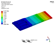 ??????? 工況2條件下柱窩附近的應(yīng)力達到峰值,已達408.28MPa。頂梁中間筋板左側(cè)上部的應(yīng)力達308.2MPa,頂梁右側(cè)的柱窩附近應(yīng)力達264.52 MPa,左右柱窩處應(yīng)力差為43.68 MPa。與工況1情況相比,工況2情況下左右柱窩處應(yīng)力差增加了為20.35 MPa,主要是由于頂板載荷偏差增加所導(dǎo)致的。頂梁越靠近后端變形越小,越靠近頂梁前端變形量越大。