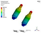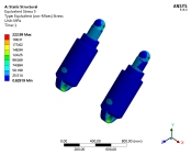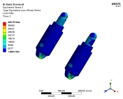??????? 立柱缸體在工況1條件下的最大等效應(yīng)力為222.99 MPa,最大變形量為1.0282 mm,并且在偏置載荷作用下,左右立柱的最大等效應(yīng)力有19.48 MPa的偏差量,最大變形量有0.1446 mm偏差。由工況1條件下的液壓支架立柱應(yīng)力與變形分布云圖可知,在工況1條件下立柱缸體的應(yīng)力和剛度均滿足要求。工況2條件下的最大等效應(yīng)力為443.76 MPa,最大變形量為2.0461 mm,左右立柱的最大等效應(yīng)力有28.51 MPa的偏差量,最大變形量有0.2103 mm偏差。由工況2條件下的液壓支架立柱油缸應(yīng)力與變形分布云圖可知,在工況2條件下立柱缸體的應(yīng)力和剛度均滿足要求。