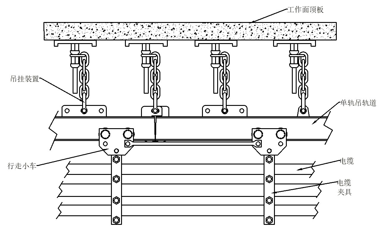 由于綜采工作面每回采30m左右,變電列車、供電電纜及液壓管線都必須隨綜采設備一起前移,以往移動電纜及管線采用慢速絞車進行牽引,電纜和管線在地面上拖拽,摩擦阻力很大,極易造成電纜磨損、拉斷等安全隱患。作業(yè)過程中還存在電纜及管線易出現(xiàn)扭結(jié)、套勁等問題,必須多人進行整理,造成作業(yè)人員勞動強度大,工作效率低。為了有效解決這些在生產(chǎn)過程中出現(xiàn)的實際問題,曉南礦經(jīng)過多次試驗和改進最終研制成功并定型應用了“拖拉電纜單軌吊車”。該設備主要由軌道、行走小車、電纜夾具和吊掛裝置4個部分組成?!巴侠娎|單軌吊車”的研制與應用,實現(xiàn)了井下綜采工作面電纜及液壓管線沿著順槽固定軌道與轉(zhuǎn)載機及變電列車同步移動的目的,降低了作業(yè)人員勞動強度,提高了工作效率。