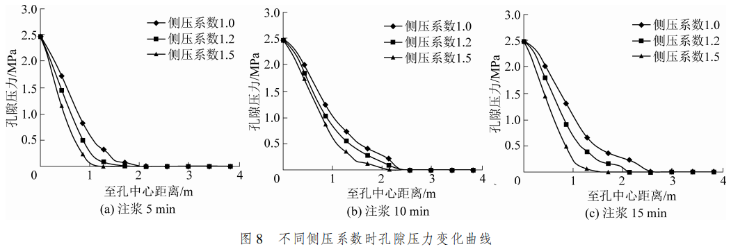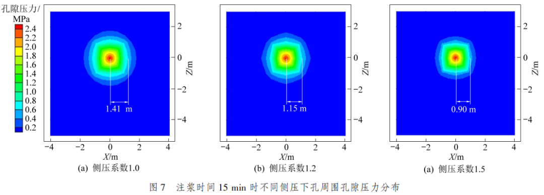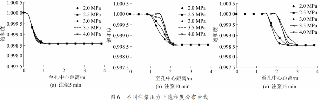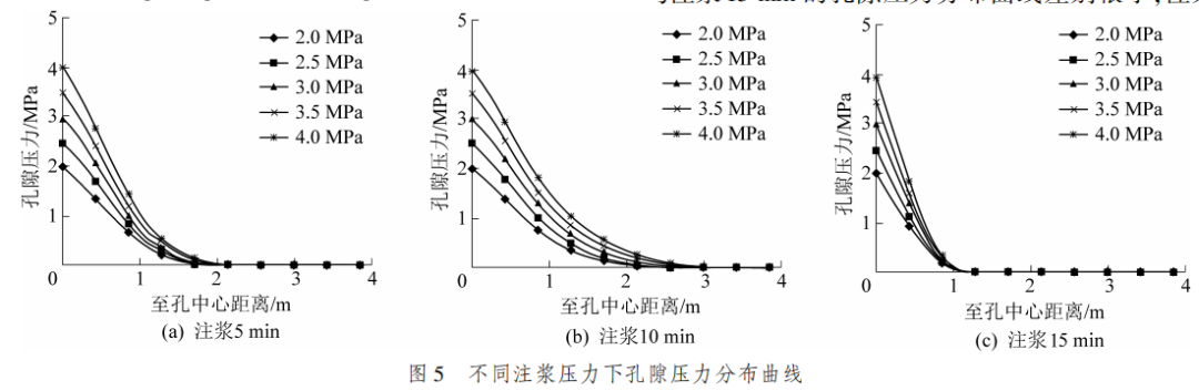 以此參數(shù)為基礎,通過數(shù)值模擬試驗揭示了注漿孔周邊孔隙壓力分布與飽和度變化規(guī)律,分析了掘進工作面不同應力狀態(tài)對漿液擴散的影響,對比了不同注漿壓力下孔隙壓力和飽和度分布曲線,發(fā)現(xiàn)應力狀態(tài)對漿液最大擴散半徑影響較小,提高注漿壓力能在一定時間段內(nèi)提高注漿效率,但并不能顯著提高漿液擴散半徑。
