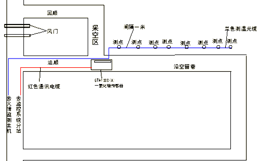 4.1.1 利用火情監(jiān)測系統(tǒng),對N1-1502 “110工法”工作面采空區(qū)進(jìn)行溫度預(yù)測、預(yù)報(bào)的安設(shè),具體的安設(shè)方法是:預(yù)先在采空區(qū)內(nèi)沿沿空留巷采空區(qū)內(nèi)鋪設(shè)一條測溫光纜,對沿空留巷的采空區(qū)內(nèi)的溫度進(jìn)行實(shí)時(shí)檢測,測點(diǎn)可以定為1m。通過對火情監(jiān)測系統(tǒng)一年來在曉南煤礦的使用,火情監(jiān)測系統(tǒng)對煤礦早期的自然發(fā)火的預(yù)測、預(yù)報(bào)、預(yù)防起到了很好的作用。當(dāng)某個(gè)測點(diǎn)溫度達(dá)到40。C時(shí),發(fā)出報(bào)警信號,再根據(jù)測點(diǎn)顯示的高溫位置,采取防治措施,具體安裝方法如圖3所示: