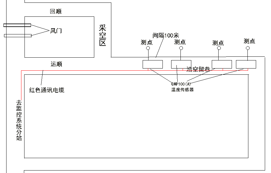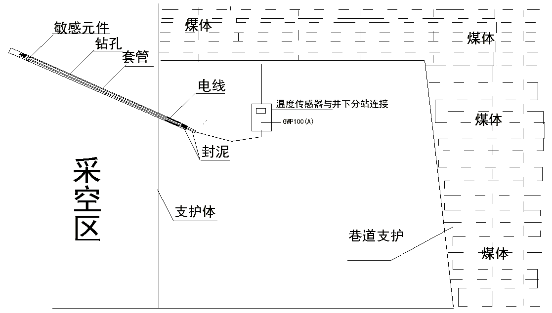 4.1.2利用溫度傳感器,對沿空留巷沿途每間隔100m進(jìn)行重點(diǎn)區(qū)域進(jìn)行檢測,確保數(shù)據(jù)準(zhǔn)確及可靠。采空區(qū)檢測點(diǎn)距支護(hù)巷道表面1.5-3.0m的區(qū)間。為監(jiān)測5-7m區(qū)間采空區(qū)溫度的變化(如有需要可加長檢測元件電纜的長度),將GWP100(A)型溫度傳感器的檢測元件加長連接線(采用4×1.5mm2礦用阻燃電纜)達(dá)10m,在使用前對傳感器檢測數(shù)據(jù)失真狀況進(jìn)行調(diào)試,對自然發(fā)火重點(diǎn)部位打孔徑為Φ15mm、深度達(dá)到采空區(qū)5-7m,埋入傳感器檢測元件,將傳感器聯(lián)入礦井安全監(jiān)控系統(tǒng),從而實(shí)現(xiàn)對煤層深部自然發(fā)火溫度的自動(dòng)、連續(xù)監(jiān)測,配合火情監(jiān)測系統(tǒng)測溫裝置,更好地實(shí)現(xiàn)預(yù)報(bào)自然發(fā)火的作用。