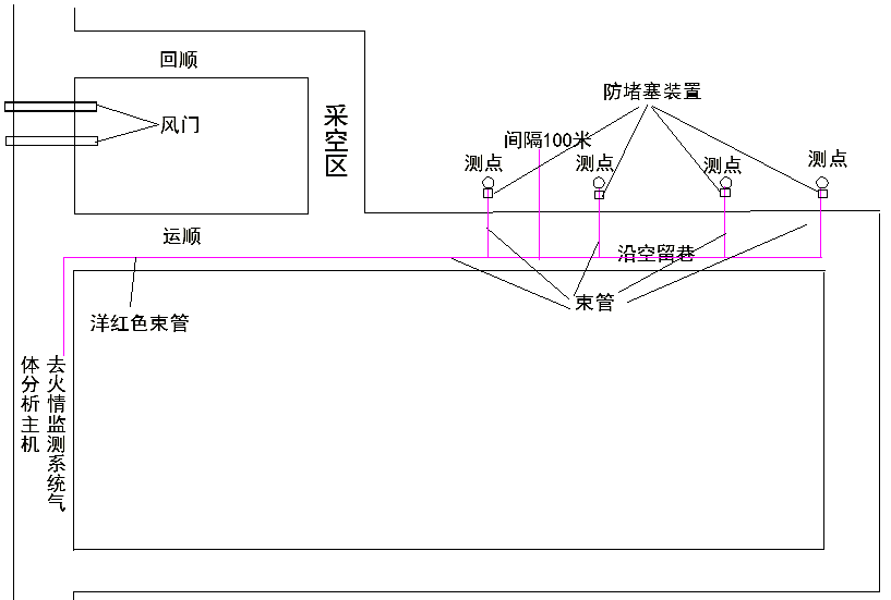 4.1.4利用火情監(jiān)測系統(tǒng)氣體分析主機(jī)對沿空留巷采空區(qū)的氣體進(jìn)行分析化驗(yàn)后將數(shù)據(jù)傳輸?shù)降孛婊鹎楸O(jiān)測系統(tǒng)中心站,并對數(shù)據(jù)進(jìn)行分析處理被告超限報(bào)警。在回風(fēng)留巷打孔,將束管穿過支護(hù),進(jìn)入采空區(qū)3到5m(如有需要可以根據(jù)實(shí)際情況加長束管的伸入長度),為防止束管口堵塞,管中要安設(shè)防堵塞裝置,當(dāng)CH4、CO、C2H2、O2?和CO2這幾種氣體中,CO、C2H2出現(xiàn)時(shí),說明采空區(qū)已有自燃發(fā)火現(xiàn)象。安裝方法見圖6所示。