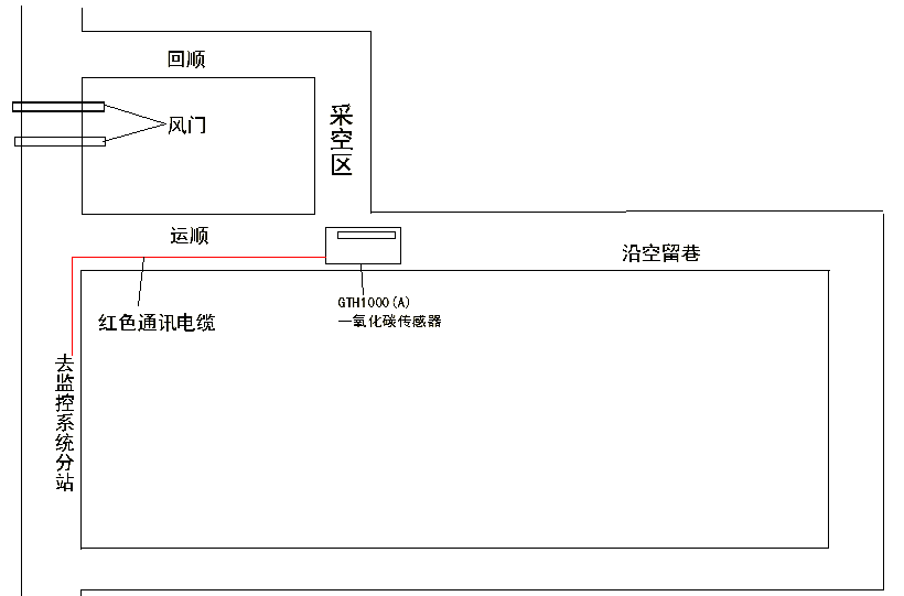 ? ? 4.1.5因?yàn)樽匀话l(fā)火是一個(gè)較慢長的變化,所以在沿空留巷的末端也就是N1-1502工作面運(yùn)順端頭,安設(shè)一臺一氧化碳傳感器,來檢測通過沿空留巷風(fēng)流的一氧化碳濃度,以此來判斷沿空留采空區(qū)是否有自然現(xiàn)象及采空區(qū)是否有風(fēng)漏入沿空留巷,從而來分析采空區(qū)的自然發(fā)火情況,當(dāng)一氧化碳含量達(dá)到100ppm時(shí),說明自燃發(fā)火存在自燃發(fā)炎現(xiàn)象。一氧化碳傳感器的安設(shè)數(shù)量可以根據(jù)實(shí)際情況具體安設(shè),增加密度,CO傳感器的安設(shè)位置如圖7所示: