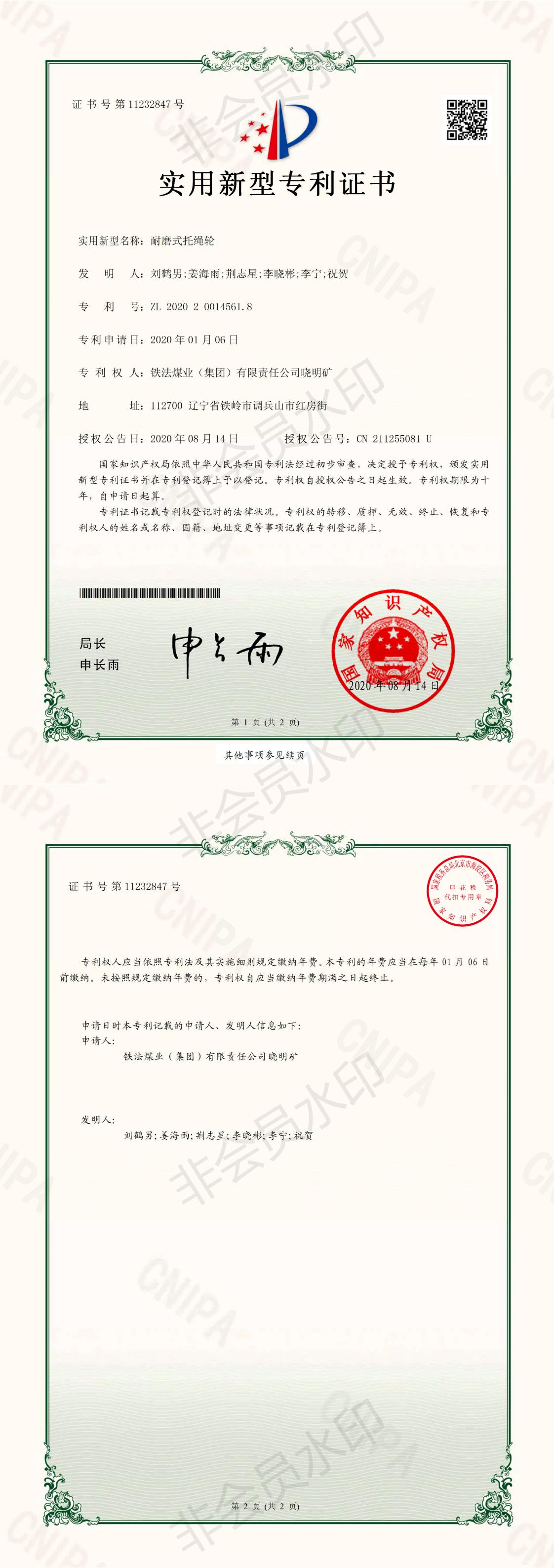 近日,曉明礦域外項目部自行研制的“耐磨式托繩輪”獲得國家知識產(chǎn)權(quán)局實用新型專利授權(quán),專利號為:ZL 2020 2 0014561.8。