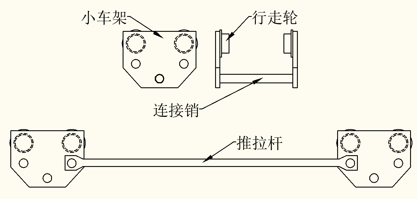 行走小車主要的作用是通過夾持在軌道上的行走輪,使吊掛電纜可以在軌道上滑行,前進或后退。行走小車每1m置一個,小車間的推拉桿長度1m,用1寸鍍鋅管制成,其作用是當行走小車由高到低安裝時,擋住行走小車向前下滑,當行走小車由低到高安裝時同樣能保證行走小車向后下滑。每件行走小車可起吊重量1t,滿足起吊需要。行走小車示意圖如圖4所示。