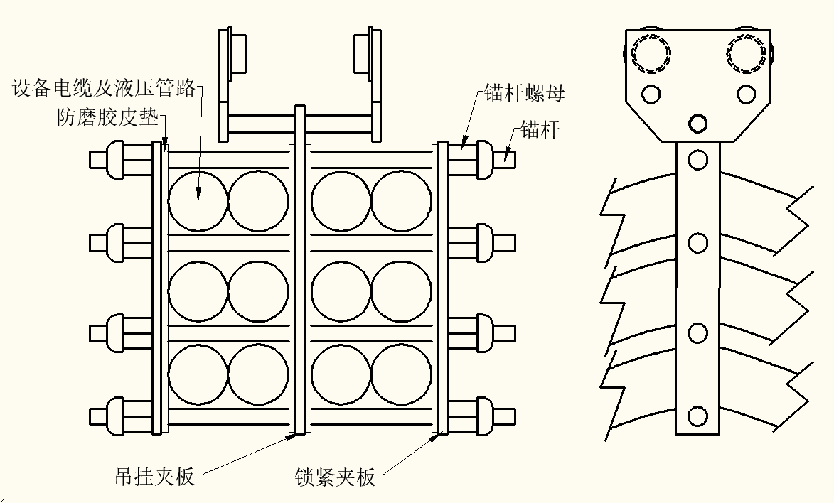 電纜夾具如圖5所示。電纜夾具可以將電纜整齊的固定在單軌吊上。電纜夾具由12mm厚鐵板加工而成,分為吊掛夾板及兩側的鎖緊夾板,吊掛夾板的作用是與行走小車連接將電纜夾具與小車連接成一體。鎖緊夾板的作用是通過擰緊兩端錨桿螺帽,將內部電纜夾緊固定,防止電纜發(fā)生竄動。電纜夾具的間隔錨桿為Φ22×400mm,間隔錨桿的長度可以根據所夾持電纜數量的多少增加或縮短。使用時錨桿外側套橡膠管,夾板內側墊皮帶防止錨桿及金屬夾板直接與電纜外皮接觸導致磨損。鋪設時將電纜鋪設在上層,液壓管路鋪設在下層,一是防止液壓管路泄露后導致電纜淋水,二是便于檢修液壓管路竄液等故障。