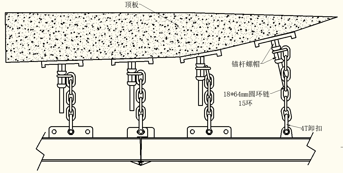 吊掛裝置如圖6所示。吊掛裝置由15環(huán)18*64mm圓環(huán)鏈及4T卸扣組成。4T卸扣方便與單軌吊軌道快速連接,圓環(huán)鏈與工作面頂板專用起吊錨桿連接,用錨桿螺帽鎖緊。當工作面頂板高低不平時,可以通過調整圓環(huán)鏈長短保證軌道平直,使單軌吊順利通過。