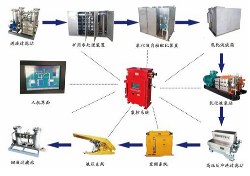 ????智能化水質(zhì)及乳化液質(zhì)量控制系統(tǒng)(圖1)主要由以下設(shè)備組成一套供液系統(tǒng),為電液控制的液壓支架提供可靠的乳化液和工作面用水。系統(tǒng)組成:進(jìn)液過(guò)濾站、原水箱、乳化油箱、預(yù)處理系統(tǒng)、電控系統(tǒng)、深度處理系統(tǒng)、自動(dòng)配比系統(tǒng)、高壓反沖洗過(guò)濾站、回液過(guò)濾站、集控系統(tǒng),人機(jī)界面。
