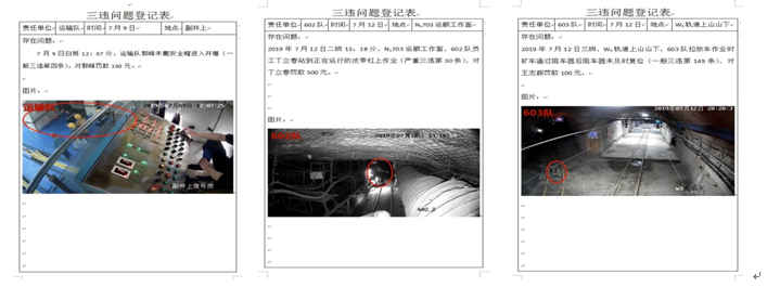 在日常工作中,井口視頻監(jiān)視室堅持守在監(jiān)控終端,實時監(jiān)管視頻監(jiān)視區(qū)域的安全生產(chǎn);通過視頻監(jiān)控回放功能,對違規(guī)違章行為進(jìn)行寫實和處理。同時,每天安排人員對井下各地點視頻存儲卡進(jìn)行回放查看,事后瀏覽追溯“三違”行為,讓以往一些很難抓住現(xiàn)形的違章行為真相大白,下達(dá)“三違”通知單除了描述“三違”行為及處理意見外,附錄“三違”截圖同時附在其內(nèi),使得“三違”人員心服口服。