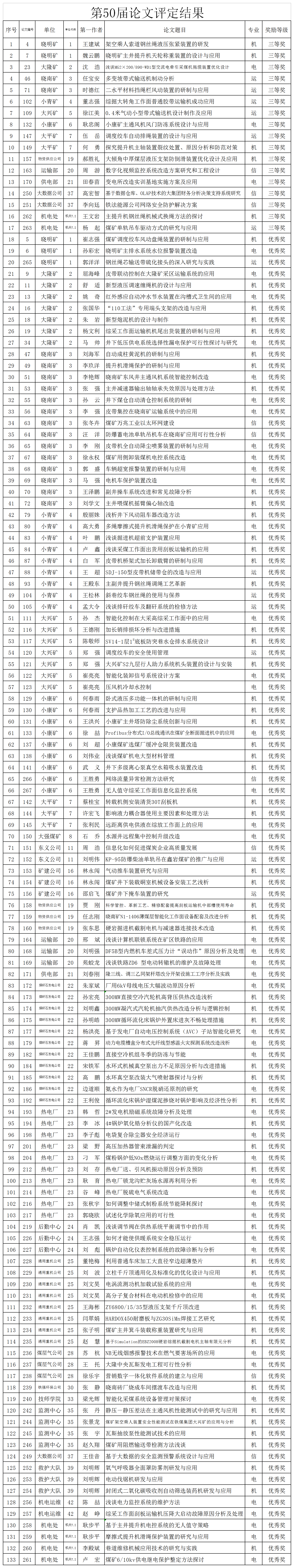 “鐵法能源公司第五十屆科技論文交流會(huì)”共征集機(jī)械、電氣、運(yùn)輸和信息化論文267篇。經(jīng)公司組織評(píng)審,確定優(yōu)秀科技論文133篇,其中三等獎(jiǎng)17篇、優(yōu)秀獎(jiǎng)116篇。對(duì)獲獎(jiǎng)?wù)撐淖髡哳C發(fā)榮譽(yù)證書,以資鼓勵(lì)。