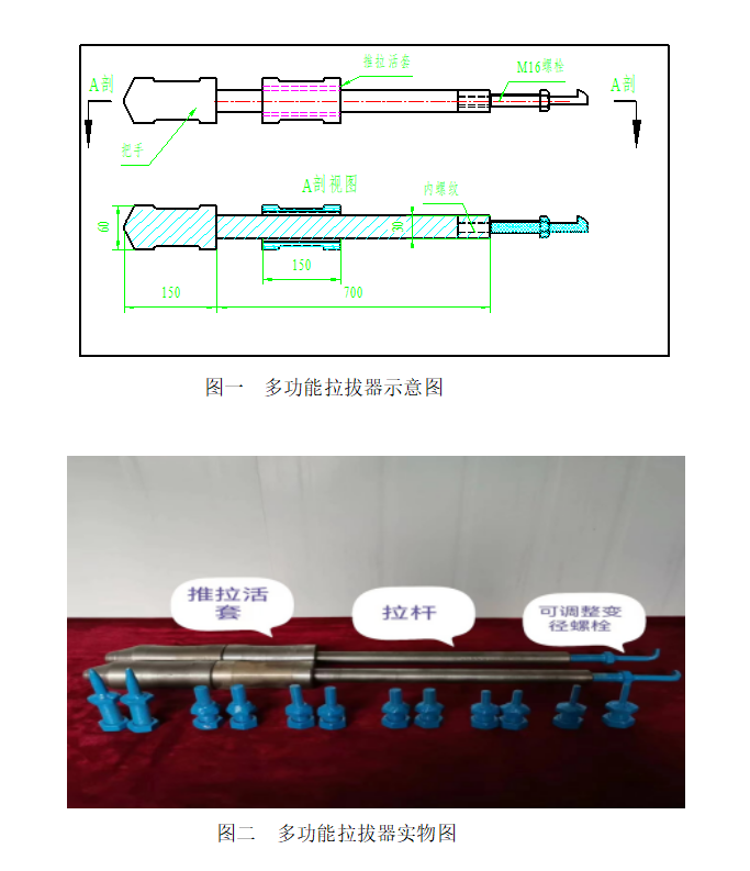 多功能拉拔器由拉桿、推拉活套、可調(diào)整變徑螺栓組成??烧{(diào)整變徑螺栓與拉桿設(shè)計為絲扣連接,拉桿端頭為內(nèi)螺紋,與配套螺栓裝配,裝配螺栓與不同直徑螺栓焊接,加工不同規(guī)格變徑螺栓,滿足被拆除配件的需要。當(dāng)被拉拔構(gòu)件無內(nèi)絲孔時,根據(jù)設(shè)備特殊位置需要,改變拉拔力的方向,制作加工90度錐形頭或90度扁頭變徑螺栓,插入被拉拔構(gòu)件縫隙內(nèi)向外拉拔。根據(jù)現(xiàn)場需要,拉拔器可以單套獨立使用,也可以兩套配合使用。根據(jù)拆除配件所受承載力,計算加工拉拔器及調(diào)整變徑螺栓。與傳統(tǒng)的施工方法相比較,多功能拉拔器具備多功能特點,操作簡單,安全可靠,降低了勞動強(qiáng)度,增加了經(jīng)濟(jì)效益,提高了安全保障。多功能拉拔器應(yīng)用在“四大機(jī)械設(shè)備”檢修中,受到使用人員的認(rèn)可,相關(guān)人員的好評,可以廣泛推廣應(yīng)用。?