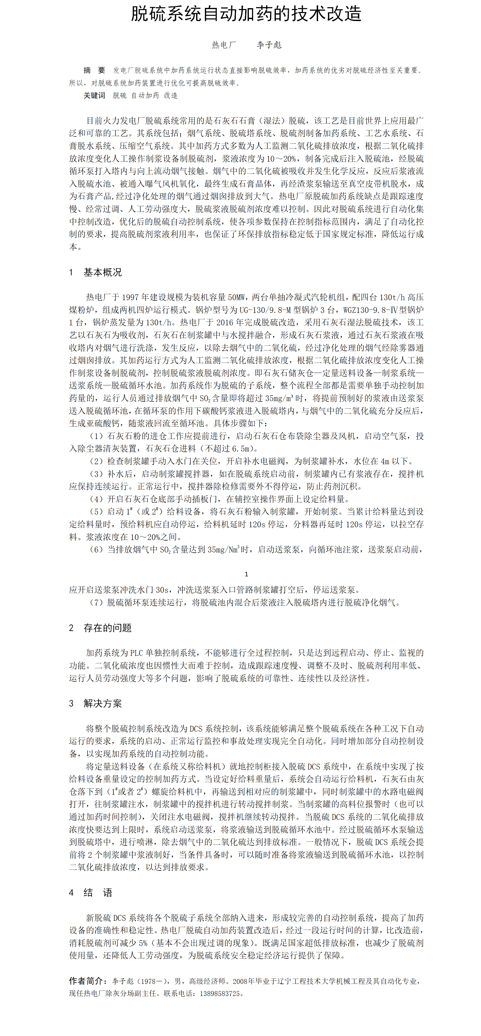 第55屆等級獎(jiǎng)?wù)撐?--脫硫系統(tǒng)自動(dòng)加藥的技術(shù)改造
