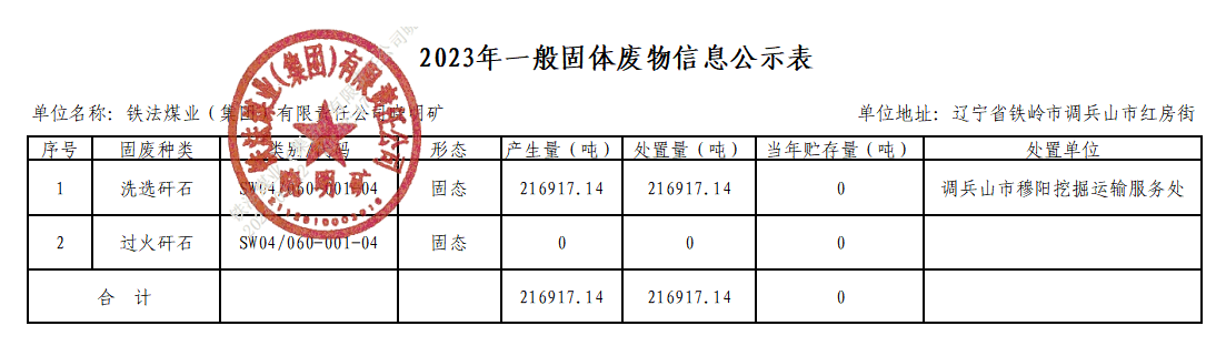 曉明礦2023年度固體廢物污染環(huán)境防治信息