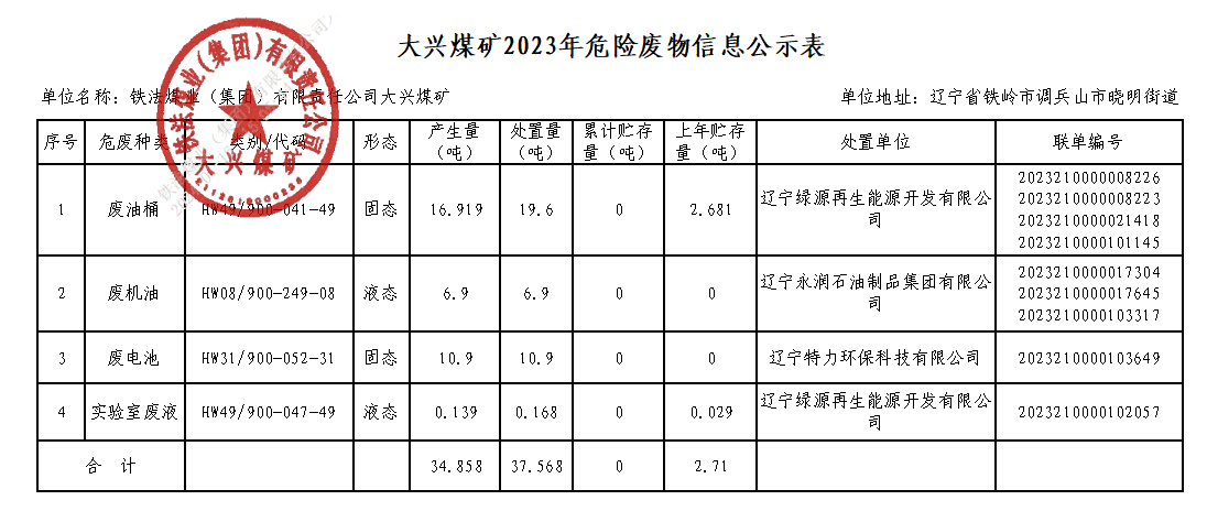 大興礦2023年度固體廢物污染環(huán)境防治信息
