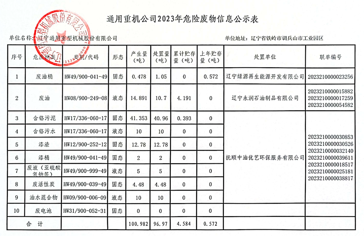 通用重機(jī)公司2023年度固體廢物污染環(huán)境防治信息