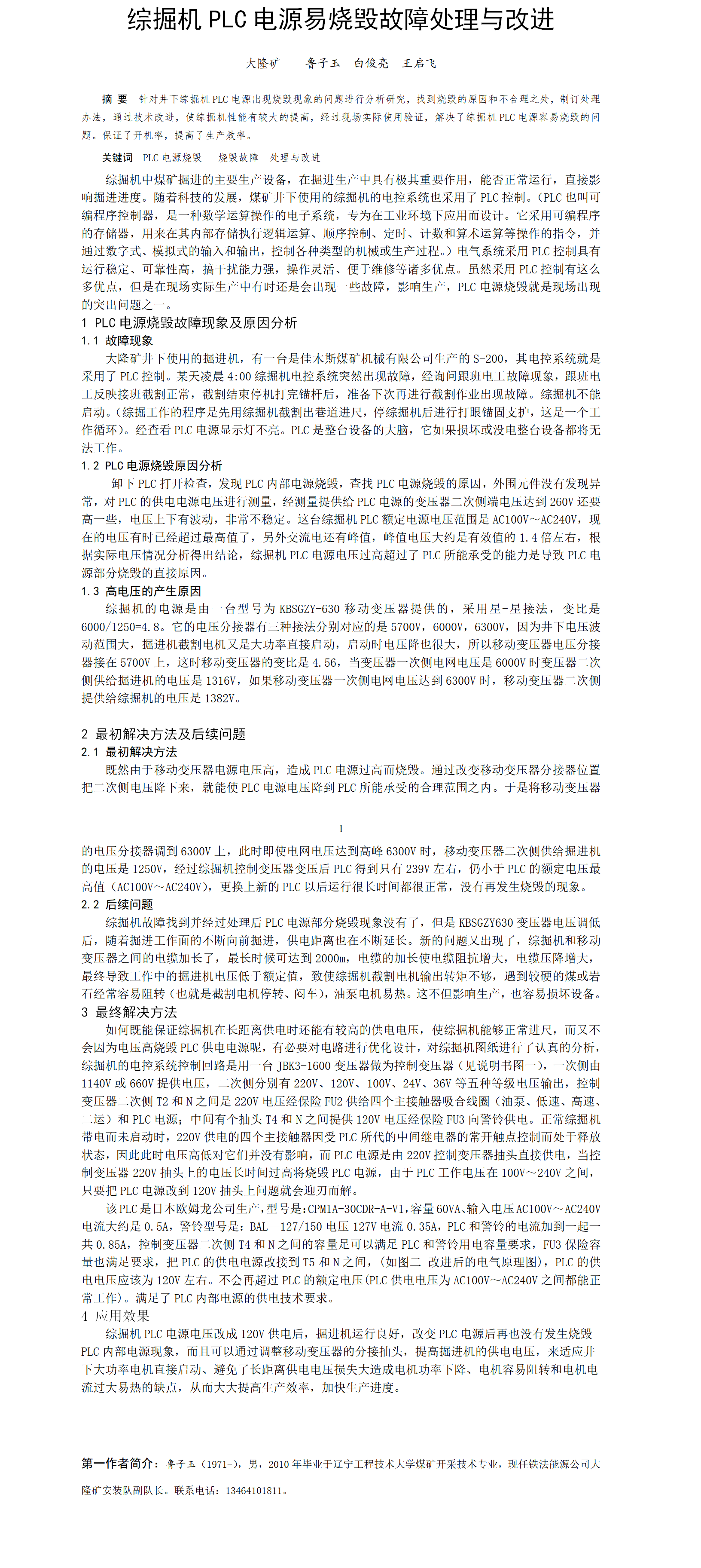 第56屆等級(jí)獎(jiǎng)?wù)撐?--綜掘機(jī)PLC電源易燒毀故障處理與改進(jìn)