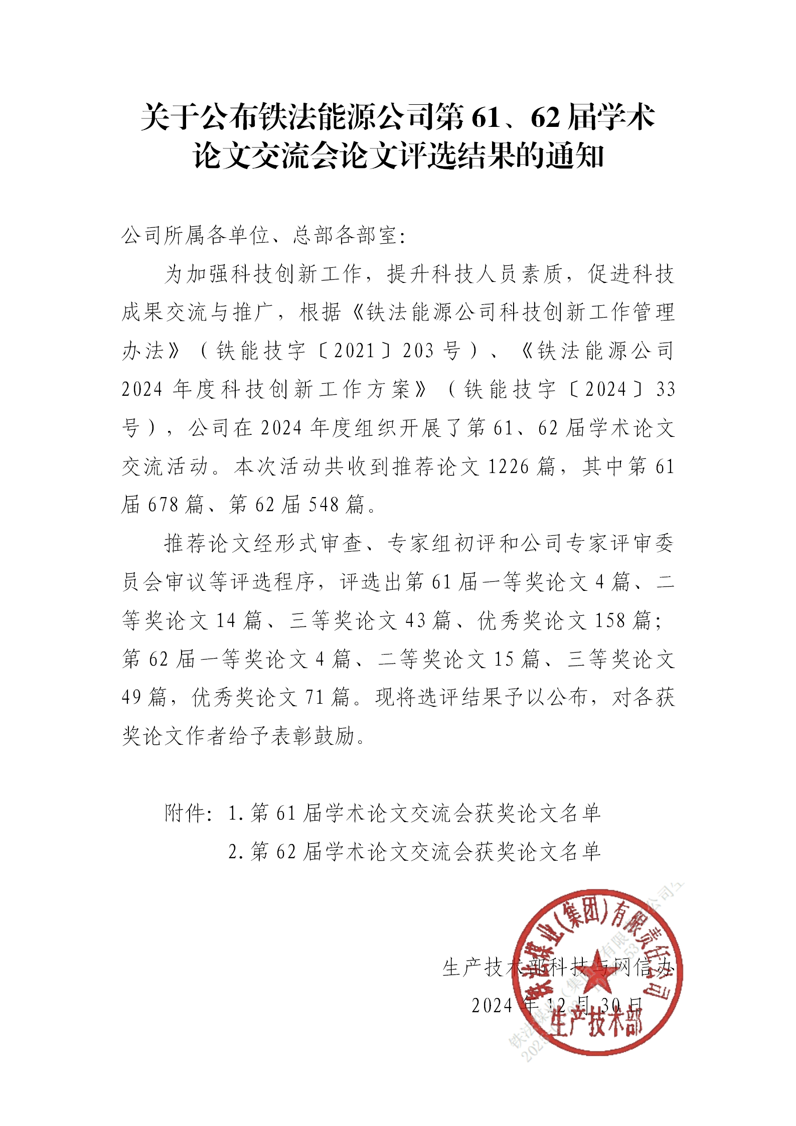 關(guān)于公布鐵法能源公司第61、62屆學(xué)術(shù)論文交流會論文評選結(jié)果的通知
