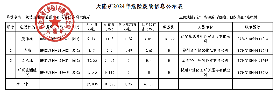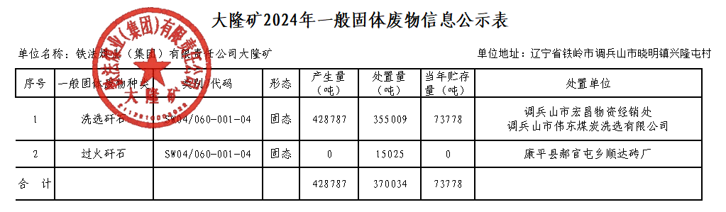 大隆礦2024年度固體廢物污染環(huán)境防治信息