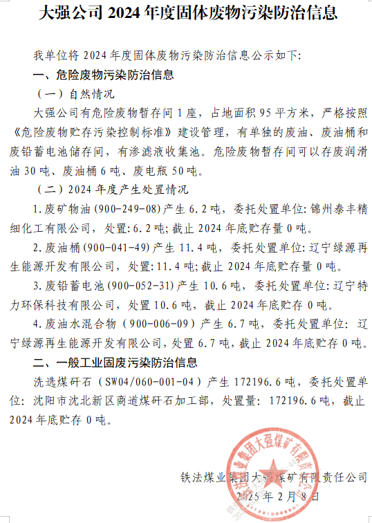 大強公司2024年度固體廢物污染環(huán)境防治信息