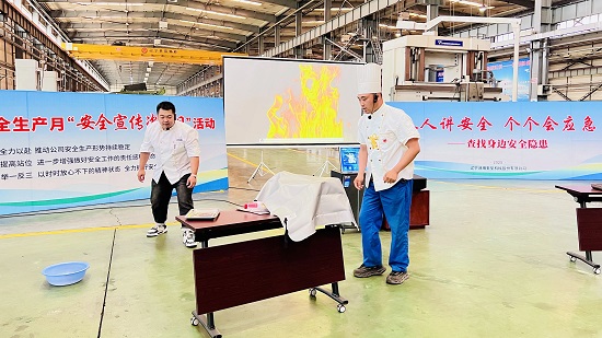 ▲通用重機(jī)公司模擬食堂煤氣泄漏、灶臺(tái)失火場(chǎng)景,向職工演示正確自救處置方法。