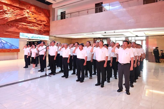 走進(jìn)展覽館,全體黨員干部列隊(duì)肅立,神情莊重,面向鮮紅的黨旗行注目禮。在公司黨委主要領(lǐng)導(dǎo)領(lǐng)誓下,大家高舉右拳,重溫入黨誓詞,以莊嚴(yán)儀式叩問初心。